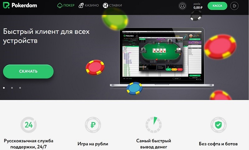 Поскольку PokerDom является российским проектом, то здесь пользователям не приходится сталкиваться с софтом на иностранном языке или техподдержкой, отвечающей на английском. Здесь все на русском – что является еще одним плюсом этого заведения. Давайте же остановимся на нем подробнее и выясним, как стать его клиентом и какие выгоды ждут игроков в этой комнате.