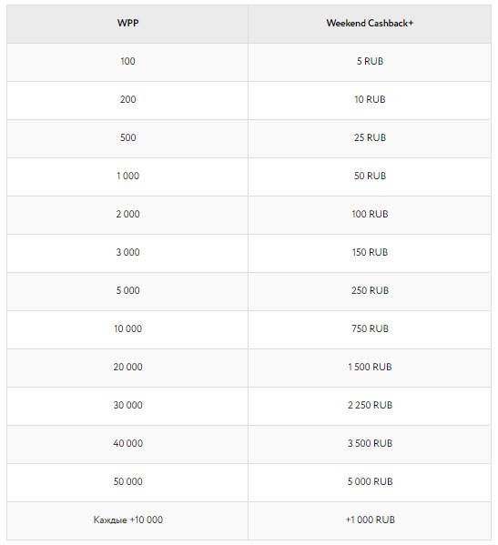 За 1 рубль рейка покеристу начисляется 1 специальный балл WPP. Чем их больше удастся набрать за выходные, тем значительнее будет рейкбек:
